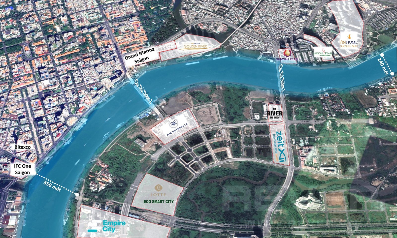 Khúc sông Sài Gòn chảy dài từ vị trí dự án Vinhomes Central Park đến vị trí dự án Empire City (như trong hình dưới) đang là nơi thu hút những dự án có giá “khủng” nhất thị trường như: